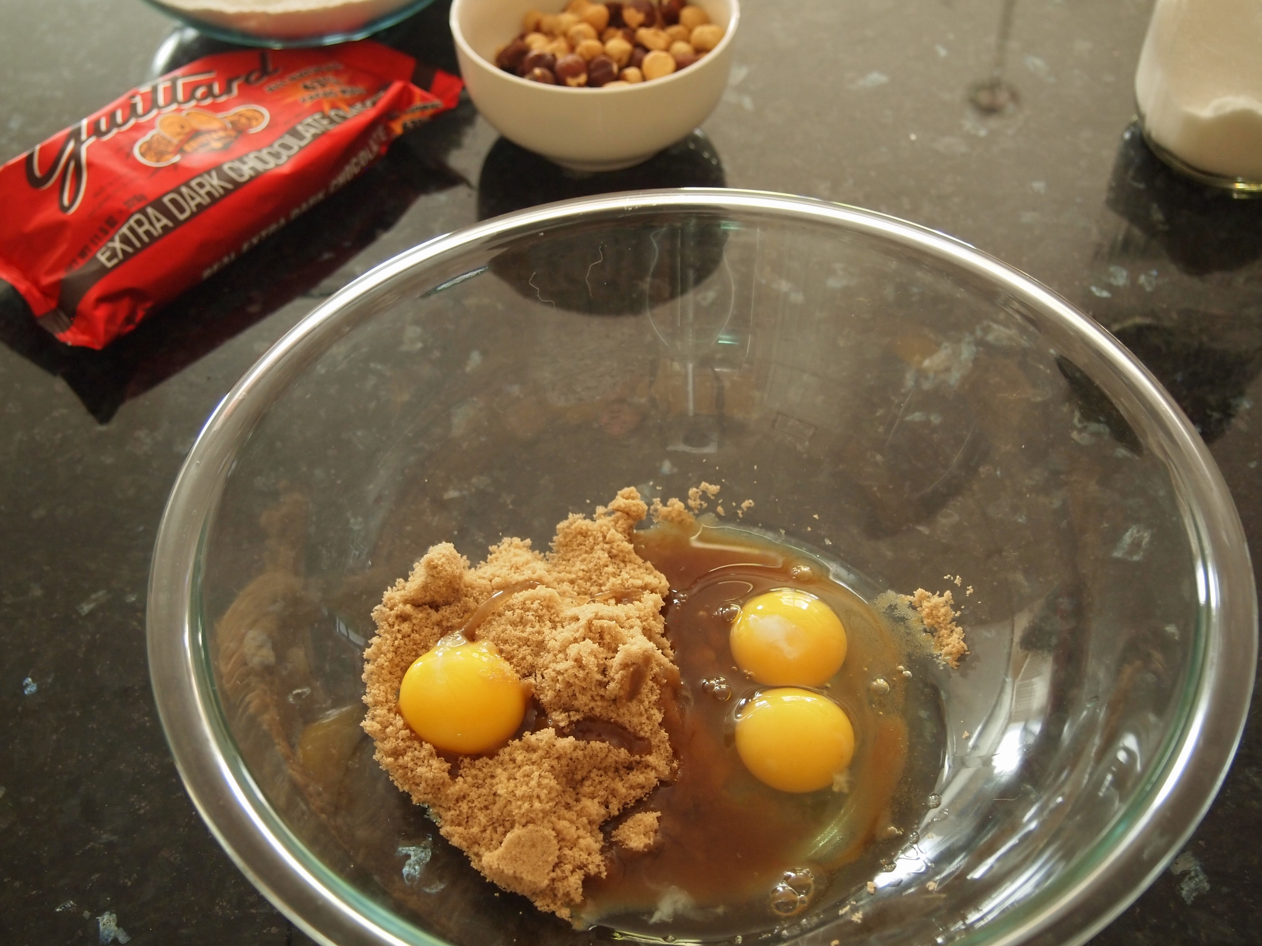 And now for a little arm workout. In a large bowl, whisk together the ¾ cup brown sugar plus the eggs and egg yolk briskly for 60 seconds (it’s tiring, I know, but keep going). The mixture should lighten in color with no visible sugar crystals and become thick and homogeneous.